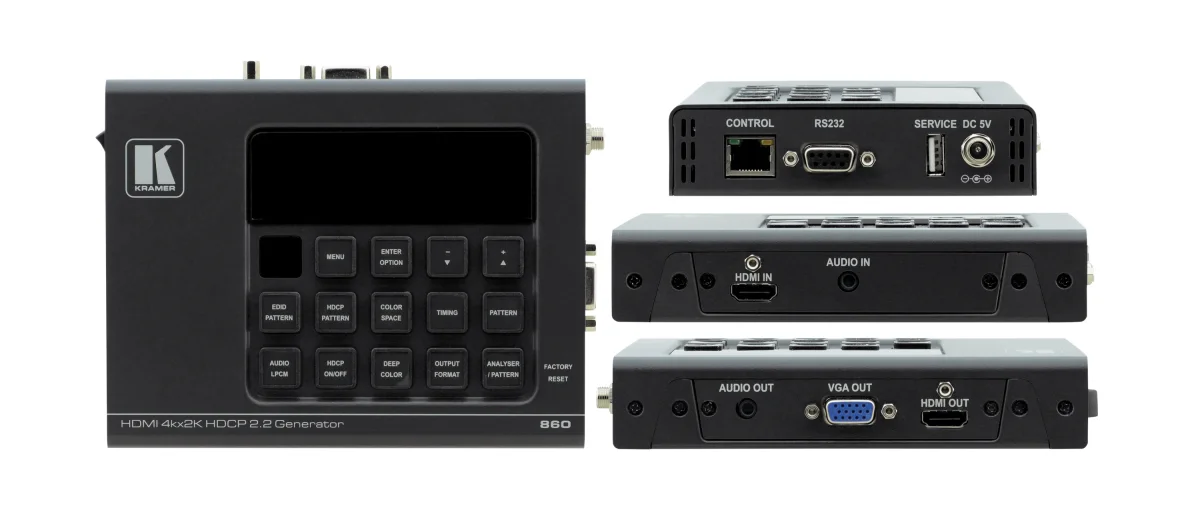 860 ist ein handlicher HDMI 18G (6G je Grafikkanal) Signal−Generator und −Analysator zum Erzeugen, Testen und Prüfen von Signalen in Systemen bis 4K @60 Hz (4:4:4) HDMI 2.0/HDCP 2.2. Mit 88 möglichen Auflösungen, 55 verschiedenen Testbildern und über einem Dutzend AV−Analysefunktionen bietet das Gerät ein sehr breites Spektrum von Testmöglichkeiten. HDMI−Datenpakete, EDID− und HDCP−Analysen werden zusammen mit EDID−Upload und −Emulation geboten. Weiterhin kann der Status− und Kontrolldaten−Kanal (SCDC) überwacht werden, wodurch 18G HDMI−Signale erkannt und analysiert werden können. Bis acht Kanäle von LPCM Audio−Testsignalen können in einem weiten Frequenz− und Pegelbereich erzeugt werden.