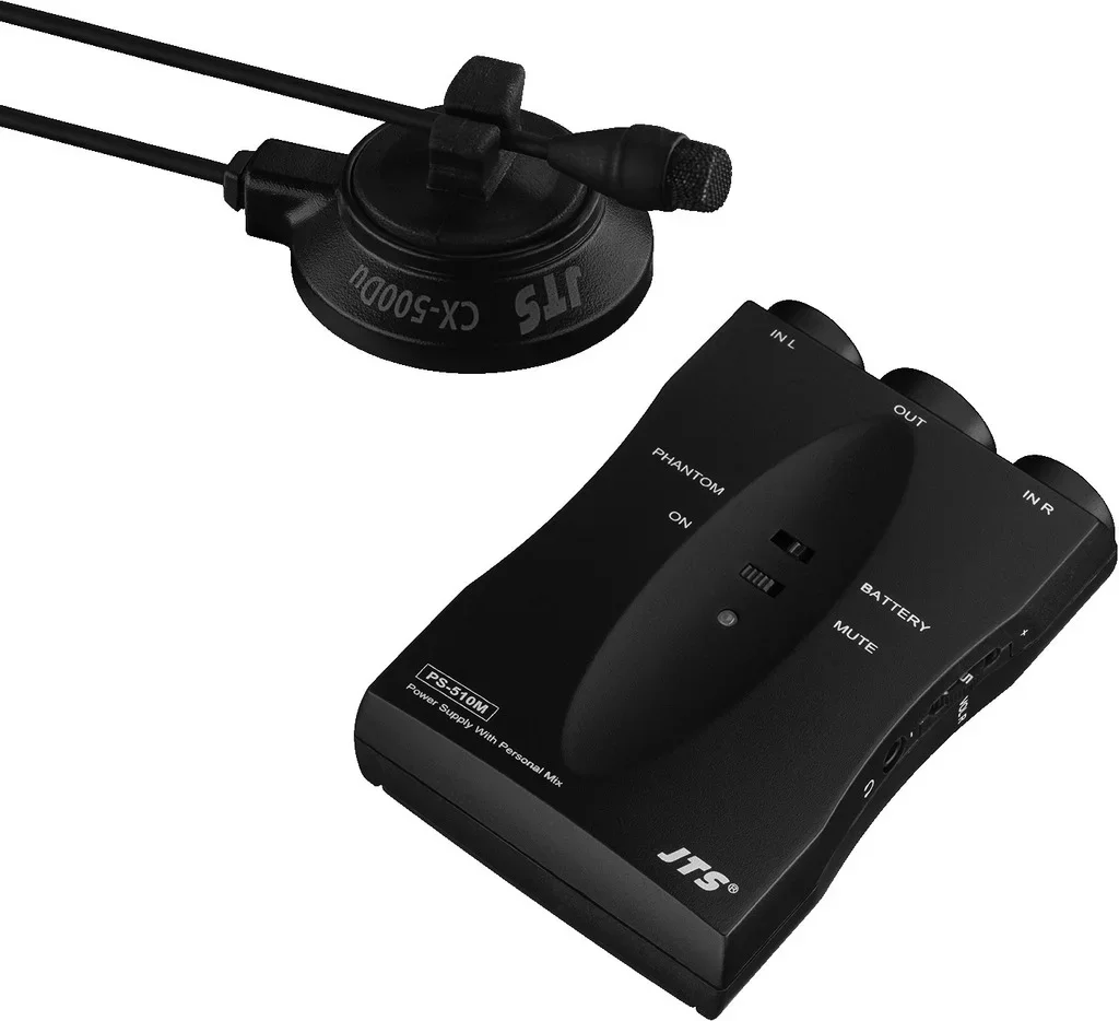 - Lautstärkeregelung von Instrumenten- und Körperschallmikrofon einzeln über beiliegenden Phantomspeiseadapter/Mixer möglich
