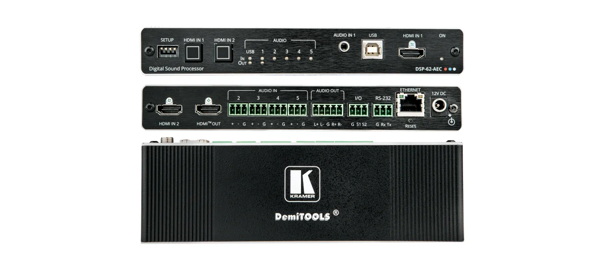 DSP−62−AEC gehört zur Kramer DSP XSPerience Familie. DSP−62−AEC ist ein hochentwickelter professioneller 6x2 Audio−Matrix−Umschalter mit Multi−Kanal DSP, AEC (Acoustic Echo Cancellation), HDMI−Auskopplung und klassenkonformer USB Audio−Schnittstelle. Die anwenderfreundliche Grafikoberfläche mit zahlreichen Einstellungsmöglichkeiten ermöglicht eine intuitive und leichte Konfiguration Ihres Audio−Systems bis ins kleinste Detail.