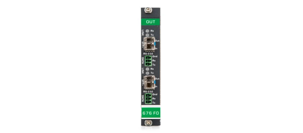 F676−OUT2−F34 is a high−performance HDMI fiber optic modular matrix output card for ultra−reach extension of 4K@60Hz (4:4:4) HDMI signals. Designed for the VS−34FD modular matrix, F676−OUT2−F34 converts HDMI and RS−232 input signals to an optical signal that is transmitted over a fiber optic cable to a compatible receiver that converts it back to HDMI and RS−232 signals. F676−OUT2−F34 includes a multi−mode SFP+ transceiver, but can be used with any Kramer certified SFP+ transceiver, such as a single−mode SFP+ transceiver.