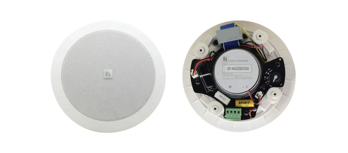 Galil 4−CO ist offener Zweiwege−Deckenlautsprecher mit einem direkten 8 Ohm Anschluss und einem 70 V/100 V Anschluss, wodurch er für Array−Installationen geeignet ist.