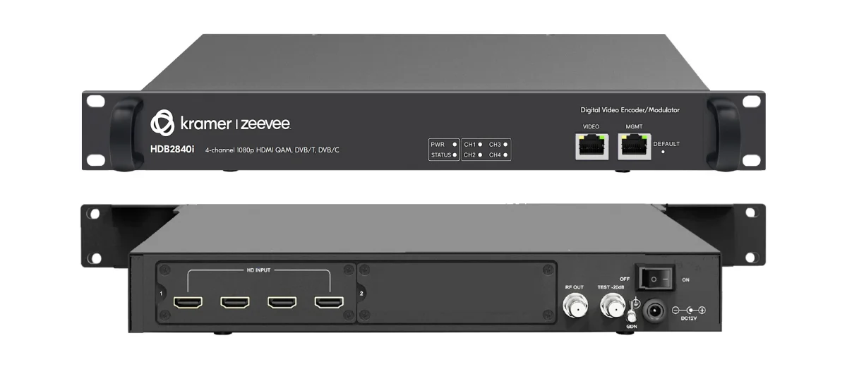 HDb2840i is an HD video encoder/QAM/DVB−T/DVB−C modulator with 4 HDMI inputs up to 1080p/1080i with embedded digital audio. MPEG−2 or H.264 QAM/DVB−T/DVB−C RF and UDP IP Stream output. Rack ears and power supply included. Cables sold separately.