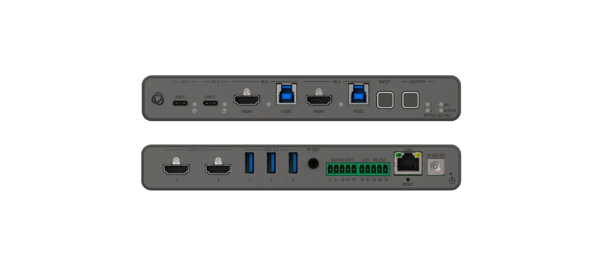 MTX3−42−HU is a high−performance matrix/auto−switcher with two USB−C and two HDMI/USB inputs and two HDMI outputs. It can independently route 4K60 4:4:4 AV signals and USB 3.2 data between connected devices. A USB 3.2 hub allows connecting USB peripherals such as room cameras and USB collaboration devices and sharing them between the hosts. The MTX3−42−HU unit is ideal for creating, captivating and immersive hybrid meeting experiences.