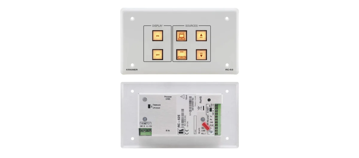 RC−62 ist eine 6−Tasten Raumsteuerung für Multimedia−Räume. Das Gerät kann entweder als selbständige Steuerung oder über KNET™ als Teil des SummitView−Systems eingesetzt werden, um AV−Komponenten oder andere Raumeinrichtungen wie Licht und Vorhänge zu steuern.