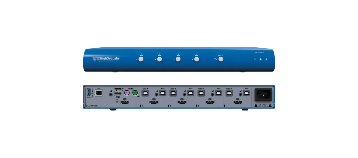 SK41HU−3 ist ein sicherer 4−Port 4K30 UHD HDMI KVM−Switch. Er ermöglicht Benutzern, Peripheriegeräte − Tastatur, Video, Maus, Audio und USB − zwischen vier verschiedenen Netzwerken/Computern auf Sicherheitsniveau zu teilen, während er alle Hosts isoliert und vor Datenlecks und böswilligen Angriffen durch gemeinsame Peripheriegeräte schützt. Er ermöglicht auch das Zuweisen eines USB−Anschlusses zu einem bestimmten Computer beim Umschalten anderer Peripheriegeräte, z.B. wenn ein USB−Smartcard−Lesegerät einem bestimmten Computer zugeordnet bleiben muss. SK41HU−3 bietet die höchstmögliche Isolierung zwischen angeschlossenen Computern und ist gemäß NIAP Common Criteria Protection Profile Version 3.0 (PP3.0) zertifiziert.