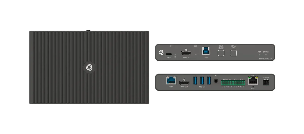 SWT3−21−HU−TR is a high−performance auto−switcher with one USB−C and one HDMI/USB input, HDMI output and long−range HDBaseT 3.0. The HDBaseT 3.0 port is configurable as either transmit (output) or receive (input) link. The unit extends a 4K60Hz (4:4:4) HDMI, USB 2.0, RS−232, IR and I/O signal over a 40 meter twisted pair cable. The local and remote connected USB peripherals, such as a room camera and microphone, are switchable for use of the switcher active USB host, for convenient hybrid meeting operation with both room and online participants. The unit is ideally deployed either at the presentation source end or at the display end.