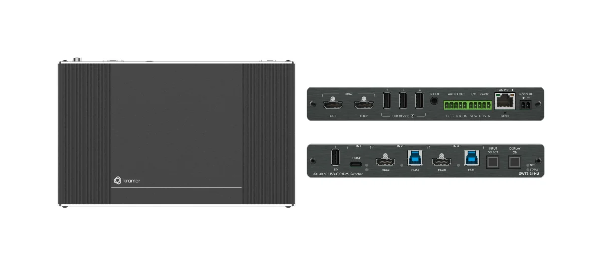 SWT3−31−HU is a high−performance auto−switcher with one USB−C and two HDMI/USB inputs and HDMI output. The connected USB peripherals, such as a room camera and microphone, are switchable for use of the active USB host, for convenient hybrid meeting operation with both room and online participants.