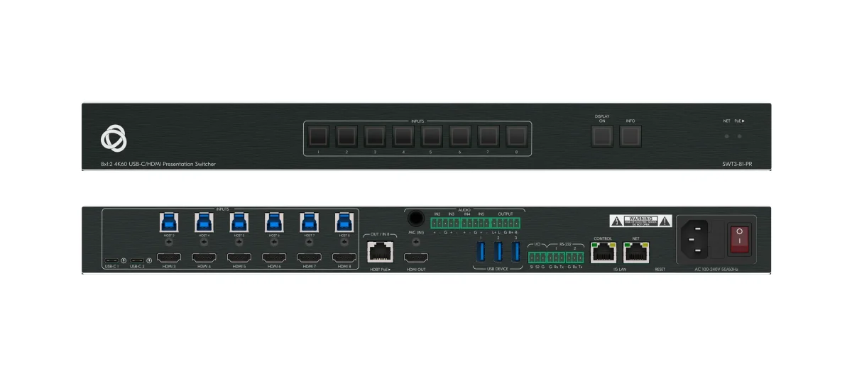 SWT3−81−PR is a high−performance video processing and fast−switching scaling switcher with coupled AV + USB routing. It has eight USB−C and HDMI/USB inputs, one interchangeable HDBaseT 3.0 input or output port, and mirrored HDMI output. The unit supports both local and remote content sharing and multi−view presentation capability. The switcher has integrated audio DSP and a rich set of analog and digital interfaces, for high−quality audio−visual experience during hybrid sessions in meeting spaces and halls.
