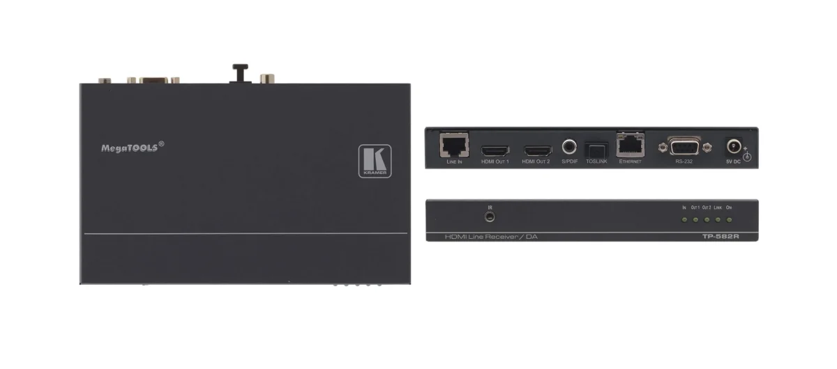 - Hochleistungs–Reichweitenverlängerer — Professionelle HDBaseT–Verlängerung mit vergrößerter Reichweite für Twisted Pair Kupferkabel mit gespiegeltem 1+1 HDMI–Ausgang. TP–582R kann direkt mit HDBaseT–konformen marktüblichen AV–Produkten betrieben werden. Für optimale Reichweite und Leistung verwenden Sie die empfohlenen Kramer–Kabel.