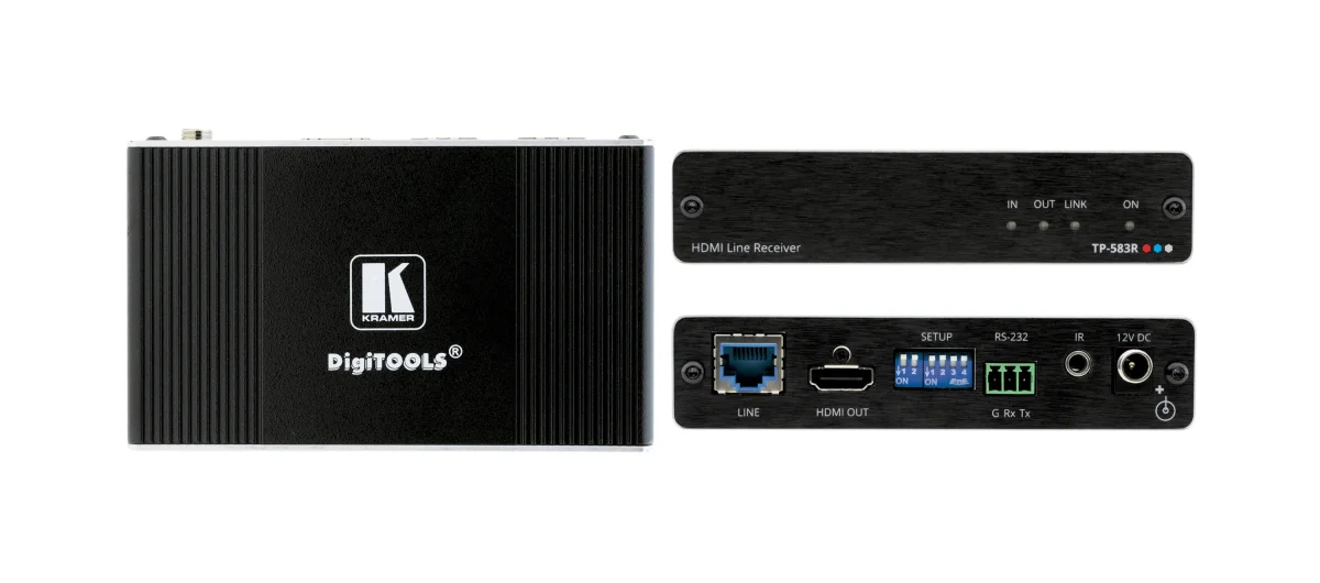 TP−583R ist ein leistungsstarker HDBaseT−Empfänger mit hoher Reichweite für 4K−HDR−HDMI−, RS−232− und IR−Signale über verdrillte Doppelleitungen. Der TP−583R konvertiert das HDBaseT−Signal und gibt es an seine HDMI− und Steueranschlüsse aus. Es ermöglicht die Erweiterung von Videosignalen auf bis zu 70m über Kramer−Kupferkabel mit einer Videoauflösung von bis zu 4K@60Hz (4:4:4). Es ist mit Standard−HDBaseT−kompatiblen Extendern bei 4K@30 und HD−Videoauflösungen kompatibel.