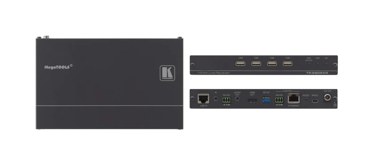 - Hochleistungs–Reichweitenverlängerung — Professionelle HDBaseT–Verlängerung für Twisted Pair Kupferkabel. TP–590RXR kann direkt an HDBaseT–konforme marktübliche AV–Produkte angeschlossen werden. Für optimale Reichweite und Leistung verwenden Sie die empfohlenen Kramer–Kabel.