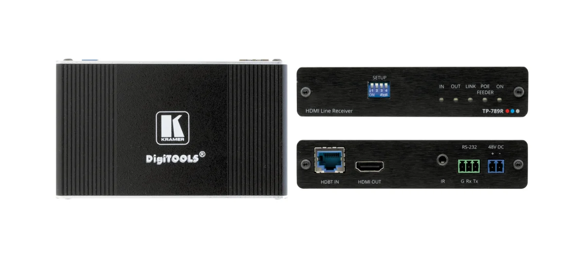 - Hochleistungs–Standard–Extender — Professioneller HDBaseT–Extender zur Bereitstellung von Signalen mit großer Reichweite und Stromversorgung über verdrillte Kupferinfrastrukturen. TP–789R ist ein Standard–Extender, der an jedes marktübliche HDBaseT–kompatible Erweiterungsprodukt angeschlossen werden kann. Verwenden Sie für eine optimale Reichweite und Leistung die empfohlenen Kramer–Kabel.