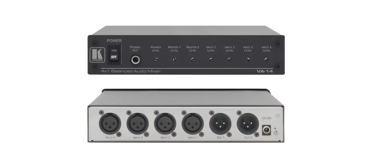 VA−14 ist ein hochwertiger 4−Kanal Mixer für symmetrische Mono−Audio Signale mit XLR−Anschlüssen. Er nimmt vier Kanäle aus einer Kombination von Line−Audio oder Mikrofon−Signalen entgegen und gibt diese an zwei Ausgängen als gemischtes symmetrisches Audio−Signal und einem Kopfhörer−Ausgang aus.