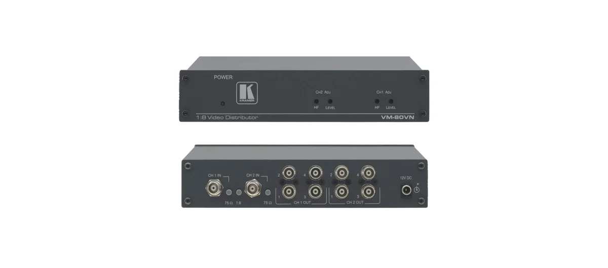 VM−80VN ist ein Hochleistungs−Verteilverstärker für Composite− oder SDI−Signale. Es kann auch als 1:4 Verteilverstärker für S−Video (Y/C)−Signale konfiguriert werden und verfügt über Steuerelemente zum Ausgleich von Signalverlusten in langen Kabelstrecken.