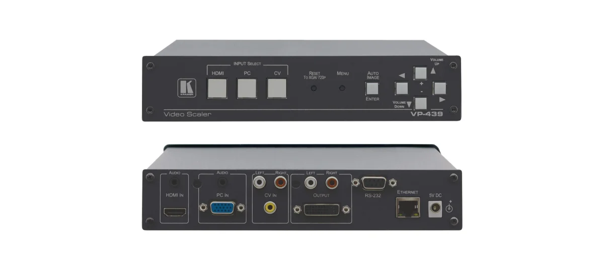 VP−439 ist ein digitaler Hochleistungsscaler für Computergrafikvideo, Comp.Video und HDMI einschl. Audio. Er skaliert das ausgewählte HDMI−, CV− oder Computergrafik−/YPbPr Signal auf− oder abwärts und gibt es als HDMI am DVI−I Ausgang aus.