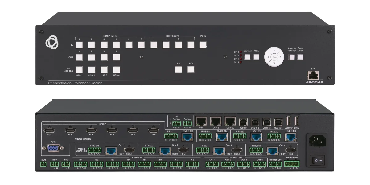 Der VP−554X ist ein leistungsstarker Präsentations−Umschalter/Scaler mit vier unabhängigen skalierten Ausgängen. Das Gerät bietet sechs HDMI−Eingänge und vier HDBaseT−Eingänge mit bis zu 4K Auflösung, einen VGA Legacy−Eingang sowie je Ausgang gespiegelte HDMI− und HDBT−Signale. Er unterstützt integrierte symmetrische analoge Stereo−Audiosignale, bis zu zwei Mikrofonanschlüsse, DSP−Audiofunktionen sowie einen integrierten Stereo−Endverstärker. VP−554X bietet einen eingebauten Ethernet−Umschalter und unterstützt RS−232− sowie Infrarot− und Ethernet−Tunneling über HDBT.