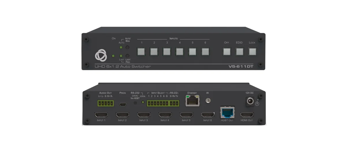 VS−611DT ist ein leistungsstarker automatischer Umschalter für HDMI−Videosignale mit einer Auflösung bis 4K @60 Hz (4:2:0). Mit sechs HDMI−Eingängen kann das Gerät automatisch oder manuell auf einen vordefinierten oder zuletzt verbundenen Eingang umschalten, wenn das aktuell aktive Videosignal unterbrochen wird oder wenn ein Videosignal mit höherer Priorität aufgeschaltet wird. Das Ausgangssignal wird auf HDBaseT und HDMI 4K @60 Hz (4:2:0) Ausgänge verteilt.