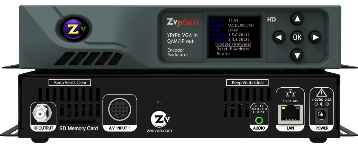 ZvPro610i−NA is an HD video encoder/QAM modulator with one DIN input for Component video; digital and analog audio or VGA video/analog audio up to 1080p. MPEG−2 QAM RF and UDP IP stream output. Delay match analog audio out for analog audio input. Closed Captions supported on composite input. Includes power supply. Hydra cables and Rack Kits are sold separately. No ZvShow.NOTE: These modulators will not work with DirecTV H26K satellite receivers.