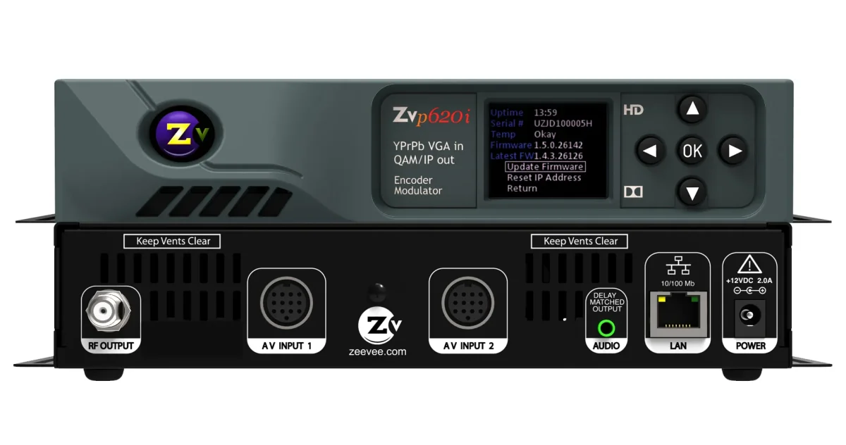 ZvPro620i−NA is an HD video encoder/QAM modulator with two DIN inputs for Component video; digital and analog audio or VGA video/analog audio up to 1080p. MPEG−2 QAM RF and UDP IP stream output. Delay match analog audio out for analog audio input. Closed Captions supported on composite input. Includes power supply. Hydra cables and Rack Kits are sold separately. No ZvShow. NOTE: These modulators will not work with DirecTV H26K satellite receivers.