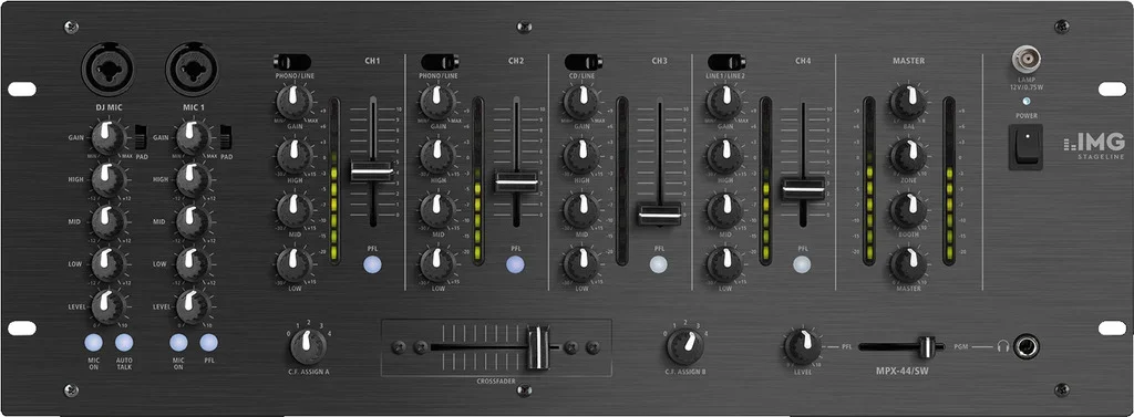 - Eingangskanäle mit Vorverstärkungsregler (Gain) und 3-fach-Klangregelung, Stereo-Eingangskanäle mit Cut-Funktion
