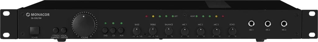 Universal-Stereo-Mischverstärker, 100 W Sing mit! Die klar strukturierte Bedienoberfläche des SA-250/SW lädt zum Musikhören und besonders zum Musikmachen ein. Jeweils eine von drei Stereo-Line- und drei Mono-Mikrofon-Quellen können unkompliziert miteinander gemischt werden. In Verbindung mit speziellen Karaoke-CDs/-DVDs stehen Funktionen wie „One-Touch-Karaoke” oder „Vocal-Partner” zur Verfügung. Ein regelbares Digitalecho kann den Mikrofonkanälen als Effekt zugemischt werden. Das lüfterlose Kühlkonzept des Verstärkers sorgt für geräuschlosen Betrieb. Moderne Schutzschaltungsmechanismen bieten Sicherheit bei Überlastung, Überhitzung und Kurzschluss.